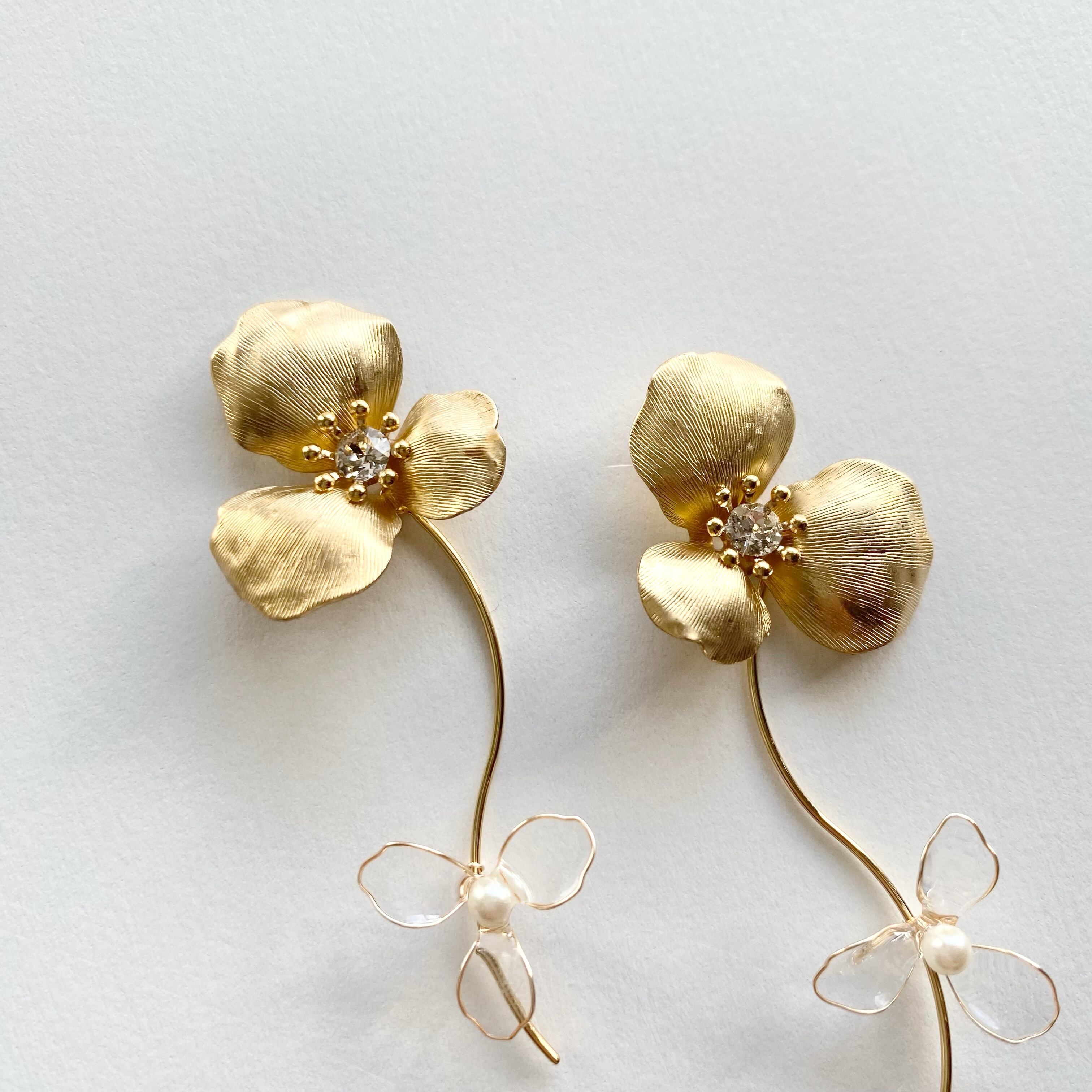 ディップアート技法にてワイヤーからお花を製作しております。大ぶりな見た目に反してとても軽く耳に負担がかかりにくいです。